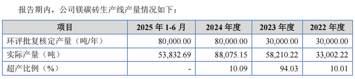 在招股书中,国亮新材还特别提示了镁碳砖车间超产风险。2025 年 1-9 月,公司镁碳砖车间的实际产量为 8.5万吨,环评批复核定产能为 8万吨/年,超产比例为 6.31%。若公司后续生产计划及防超产措施失效,公司 2025 年度镁碳砖车间的实际产量存在超过环评批复核定产能30%的风险以及因此受到相关主管部门行政处罚的风险。