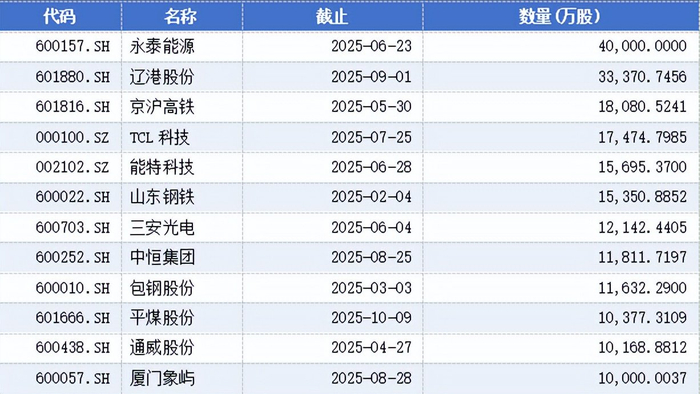 从已完成股份回购的企业回购数量来看,永泰能源、辽港股份、京沪高铁、TCL科技、能特科技、山东钢铁、三安光电、中恒集团、包钢股份、平煤股份、通威股份、厦门象屿累计回购数量较多,均超1亿股。