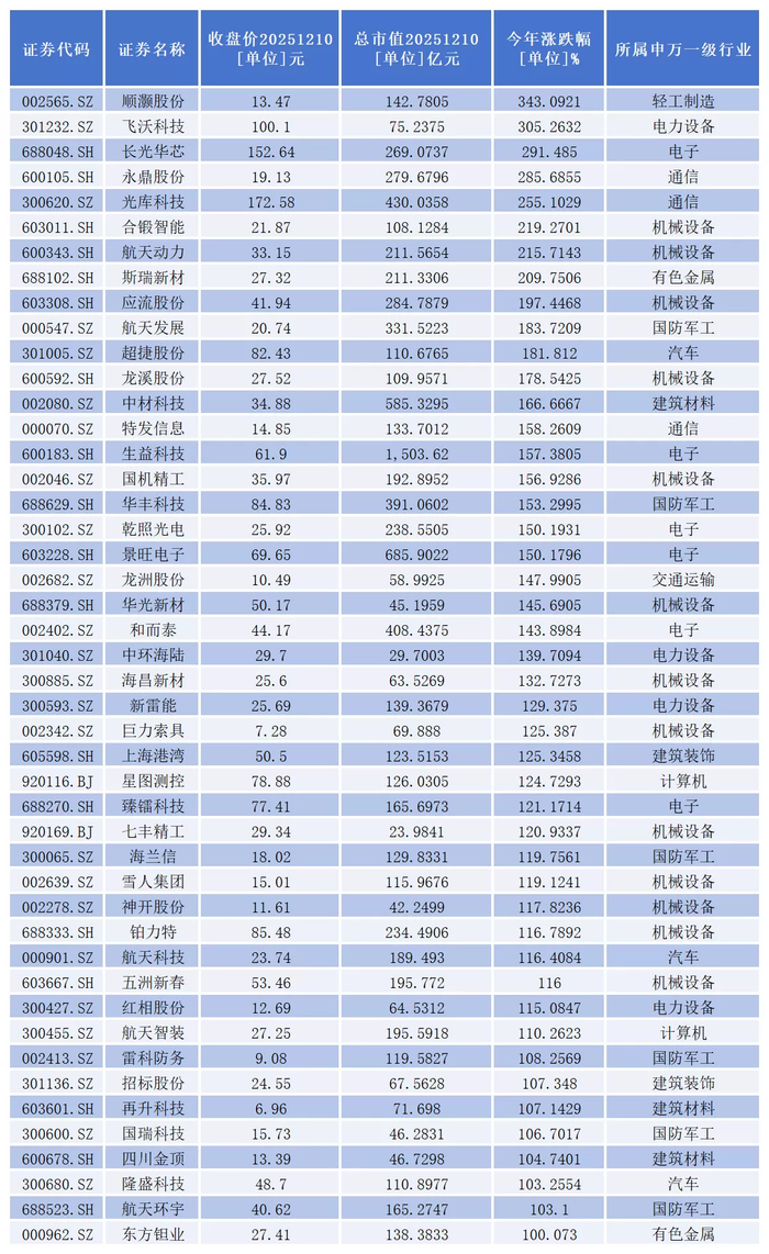同花顺数据显示,目前,A股商业航天概念板块一共有330家上市公司。从二级市场表现看,截至12月10日收盘,今年以来,共有277家上市公司股价实现上涨。其中,46家公司年内股价涨幅超过100%。