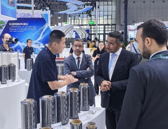 第25届中国国际工业博览会期间,沙特工业与矿产部部长班达尔·胡莱夫(Bandar Al-Khorayef)参观中国石化上海石化展台时了解碳纤维材料在风能发电、储能设备及体育休闲用品等方面的具体应用案例。