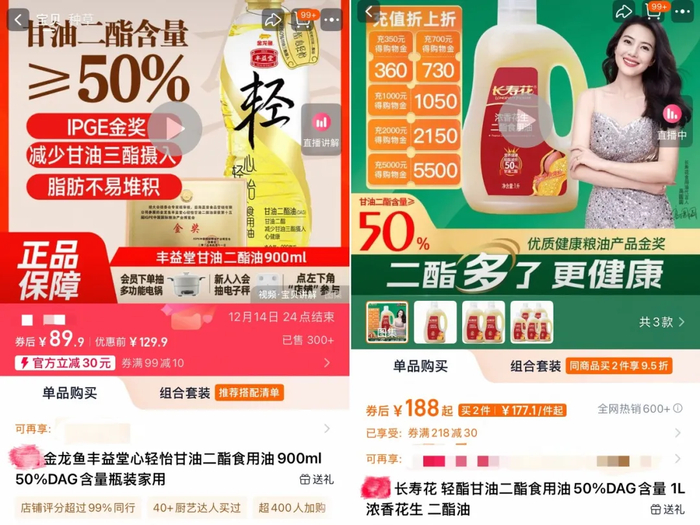 《消费者报道》记者梳理电商平台售价发现,善百年二酯食用油定价远高于普通食用油:500毫升装的善百年50%甘油二酯油券后价为294.6元/瓶,同规格80%含量款券后价更高达794.6元/瓶;而同规格的普通菜籽油、花生油仅售十几元或数十元。