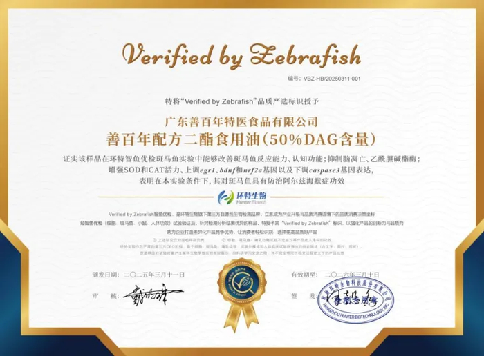 但记者仔细查阅该证书发现,证书中一栏小字标明:“细胞、斑马鱼、哺乳动物试验不完全对等产品在人体中的功效”。为何善百年仍大肆宣传其配方二酯油能帮助健康人群提前预防阿尔茨海默症,延缓阿尔茨海默症从轻度向重度发展的进程。善百年是否已开展对人体的相关临床试验?若仅以斑马鱼试验结果为依据,该数据是否足以支撑“善百年配方二酯油能帮助健康人群提前预防阿尔茨海默症”的宣传结论?