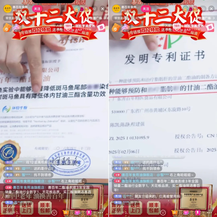 不仅是实体门店,善百年官方账号在直播过程中同样存在宣传产品功效的行为,不断向观众表示该食用油可“降低体内甘油三酯含量”,还提及能够预防“脂某肪(注:直播间规避敏感词的话术)”的专利技术。