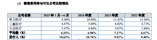 费用方面,近三年半海圣医疗的销售费用合计约1.05亿元,几乎是研发费用的两倍,而销售费用率不仅持续增长至10.63%,还始终远超同行6.25%的均值,费用控制效率落后。进一步拆解可见,超6成销售费用用于职工薪酬,且公司销售人员占比远高于维力医疗、三鑫医疗等同行,人均薪酬也处于较高水平,但人均创收却显著低于这些可比公司,“高投入低产出”的人员效率反差明显。
