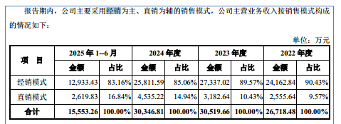 值得注意的是,公司上述产品主要通过经销商对外出售,经销模式是核心销售渠道。报告期内,经销模式产生的销售收入分别为2.42亿元、2.73亿元、2.58亿元、1.29亿元,占当期主营业务收入的比例分别为90.43%、89.57%、85.06%、83.16%,每年至少有8成收入来自经销渠道,经销商在公司销售体系中占据核心地位。
