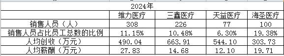 值得一提的是,海圣医疗在申报稿披露,其同行可比公司分别为维力医疗、三鑫医疗、天益医疗,而这些公司2024年关于销售相关的具体情况如下: