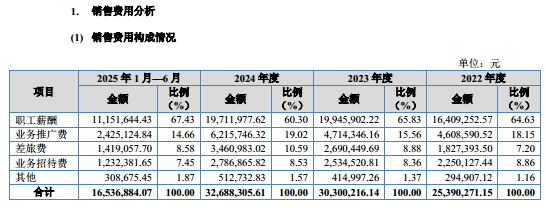 拆解销售费用明细,职工薪酬是核心构成。报告期内,职工薪酬的费用分别为1640.93万元、1994.59万元、1971.2万元、1115.16万元,分别占当期销售费用的64.63%、65.83%、60.3%、67.43%,占比始终超6成。