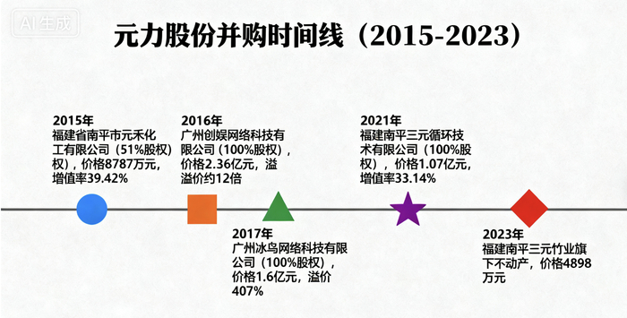 关联并购和跨界并购情况梳理,AI制图近十年间,元力股份四次收购实控人及关联方旗下资产:2015年以8787万元收购卢元健持有的福建省南平市元禾化工有限公司51%股权,间接切入白炭黑行业,标的估值增值率39.42%。