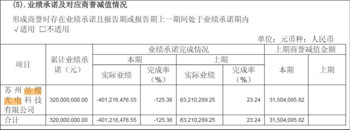 事实很快验证了市场的担忧。晶樱光电2023年净利润仅0.63亿元,业绩承诺完成率仅23.24%;2024年更是巨亏4.01亿元,业绩完成率为-125.38%。