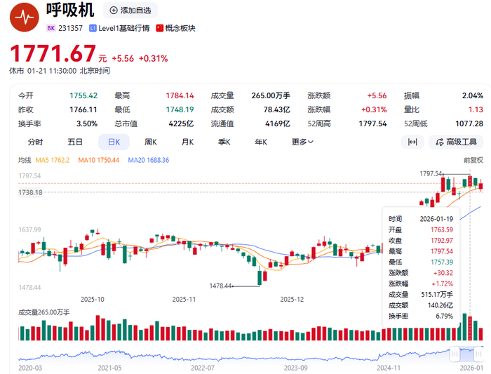自2025年11月下旬筑底以来,呼吸机概念板块(BK231357)从1478.44点起步,进入12月中旬后加速上行,至今年1月19日触及1797.54的阶段高点,60日内累计涨幅超20%。
