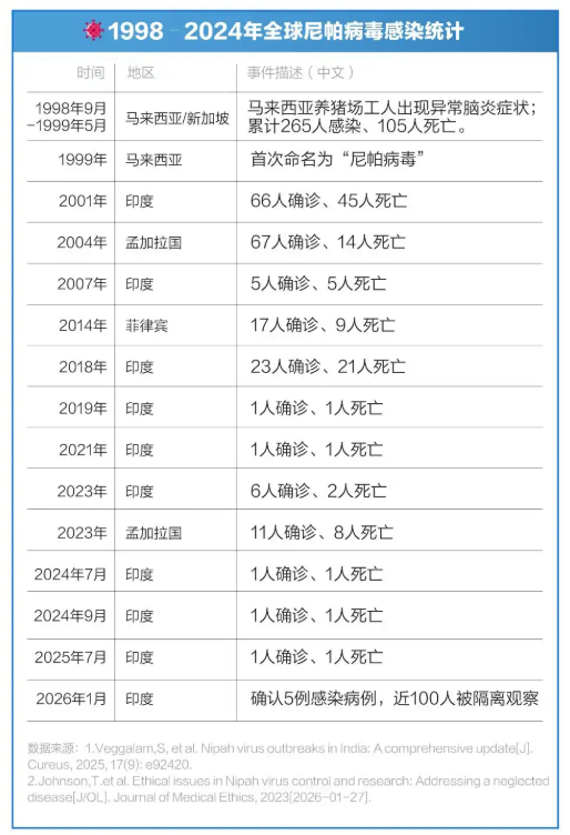 而本次2026年1月的疫情中,印度卫生部门已对近100名密切接触者实施居家隔离,隔离人群包括医生、护士、救护车司机及其家属。