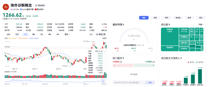 然而,狂热仅持续一日。27日板块回调0.91%,28日跌幅扩大至2.63%,较26日高点回落3.85%,近80只成分股中仅3只微涨,“一日游”行情特征明显。截至今日午间休盘,体外诊断概念报1257.85点,跌0.69%。