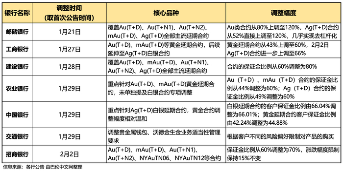 本次银行贵金属业务调整呈现“梯队式推进”特征,自1月底开始,国有大行率先启动调整,股份制银行随后跟进。国有大行作为贵金属业务的主导机构,客户基数庞大、业务规模领先,其调整举措具有较强的行业风向标意义,本次调整主要围绕投资者适当性管理、积存业务规则、保证金比例等核心环节展开,以下是巴伦中文网根据公告所整理的各行调整情况。