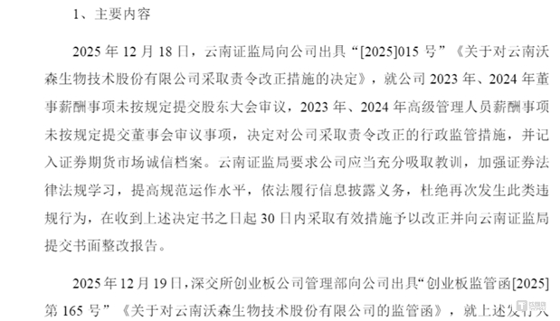 由于连续两年发放高管薪水的程序违规,2025年底,云南证监局认定,沃森生物未遵守“董事薪酬由股东大会决定,高管薪酬由董事会决定”这一基本公司治理常识。对公司采取责令改正的行政监管措施,并记入证券期货市场诚信档案。