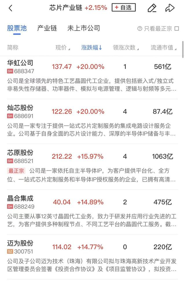 芯片产业链持续爆发,深科技6天3板,通富微电、华虹公司涨停创新高,灿芯股份、雅克科技、大为股份等涨停,芯原股份、晶合集成、康希通信、沪硅产业、中微公司等涨超10%。