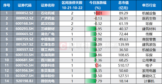 除今日大面积涨停的深圳股外,湖北地区股也于本周一度掀起涨停行情,不计算ST股,其在10月21日至22日期间,累计共有14股迎来涨停行情,其中,石化机械、广济药业、武汉控股、三峡新材4股一度晋级连板。不过,这些个股今日普遍迎来回撤,微创光电、东湖高新、理工光科等股今日跌幅相对居前,仅有石化机械再获涨停,晋级3连板。