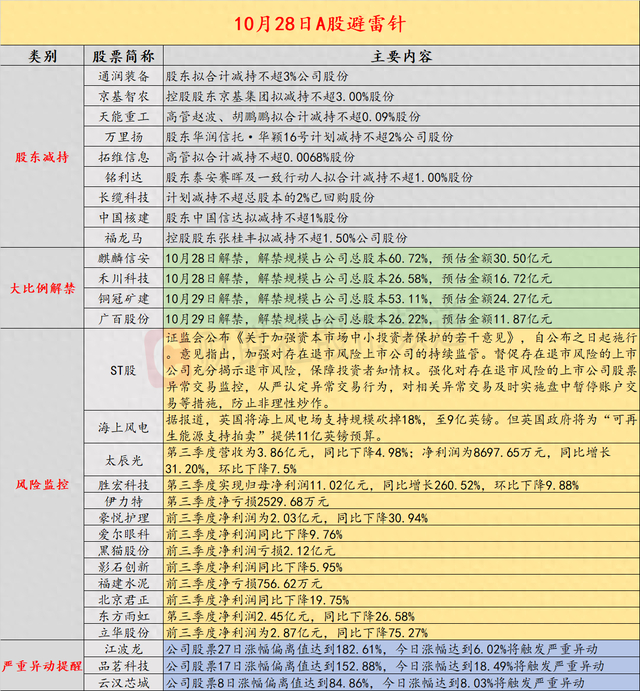 导读:财联社10月28日投资避雷针,近日,A股及海外市场潜在风险事件如下。国内经济信息方面包括:1)证监会强化对存在退市风险的上市公司股票异常交易监控,从严认定异常交易行为;2)10月27日,25年飞天茅台原箱较前一日下跌20元;公司方面重点关注包括:1)胜宏科技第三季度实现归母净利润11.02亿元,同比增长260.52%,环比下降9.88%;2)太辰光第三季度营收为3.86亿元,同比下降4.98%,净利润为8697.65万元,同比增长31.20%,环比下降7.5%;海外市场重点关注包括:1)国际贵金属期货大幅收跌超3%;2)英国将海上风电场支持规模砍掉18%,至9亿英镑。