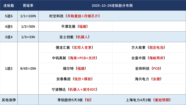 财联社10月29日讯,今日60股涨停,30股炸板,封板率为67%,时空科技6连板,平潭发展9天7板,安泰集团10天6板,上海电力15天5板,亚士创能4连板,北交所利通科技、锦华新材、三祥科技、数字人30cm首板。市场全天震荡拉升,三大指数高开高走,创业板指涨近3%创年内新高,沪指再度回升至4000点上方,北证50指数涨超8%。沪深两市成交额2.26万亿,较上一个交易日放量1082亿。板块方面,海南、光伏、有色金属等板块涨幅居前,银行、影视院线等板块跌幅居前。截至收盘,沪指涨0.7%,深成指涨1.95%,创业板指涨2.93%。