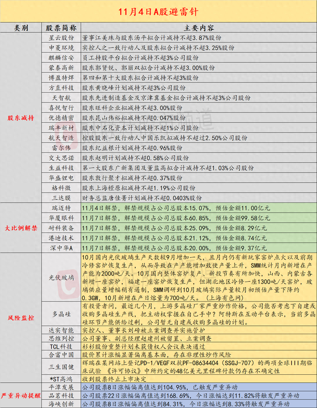 导读:财联社11月4日投资避雷针,近日,A股及海外市场潜在风险事件如下。国内经济信息方面包括:1)阿特斯回应多晶硅价格炒作,当前多晶硅环节产能供给过剩;2)10月玻璃供应增减并行,产能过剩隐患仍在增强;公司方面重点关注包括:1)达实智能实控人、董事长刘磅被立案调查并实施管护;2)思维列控公司董事、副总经理赵建州被留置、立案调查;海外市场重点关注包括:1)加密市场一度闪崩,24小时内超12亿美元头寸被平仓;2)苹果AI入华计划再延期,研发过程面临技术瓶颈。