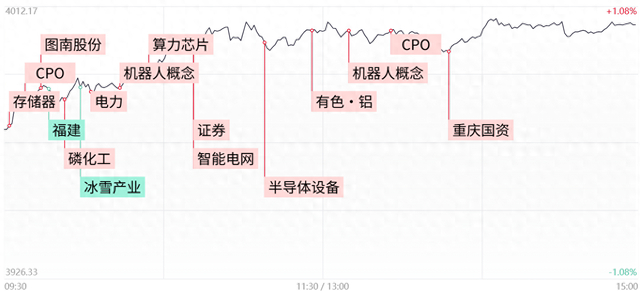 财联社11月6日讯,市场全天震荡走强,沪指放量涨近1%重回4000点。沪深两市成交额2.06万亿,较上一个交易日放量1829亿。盘面上,市场热点快速轮动,全市场近2900只个股上涨。化工板块集体爆发,云天化、澄星股份等多股涨停。电网设备板块延续强势,摩恩电气一字涨停晋级3连板。电解铝概念表现活跃,中国铝业、南山铝业、闽发铝业涨停。AI硬件概念股震荡拉升,汇绿生态、东山精密双双涨停,寒武纪涨超9%。下跌方面,旅游板块集体下挫,冰雪产业概念股领跌,大连圣亚跌停。海南板块走弱,海汽集团触及跌停。截至收盘,沪指涨0.97%,深成指涨1.73%,创业板指涨1.84%。