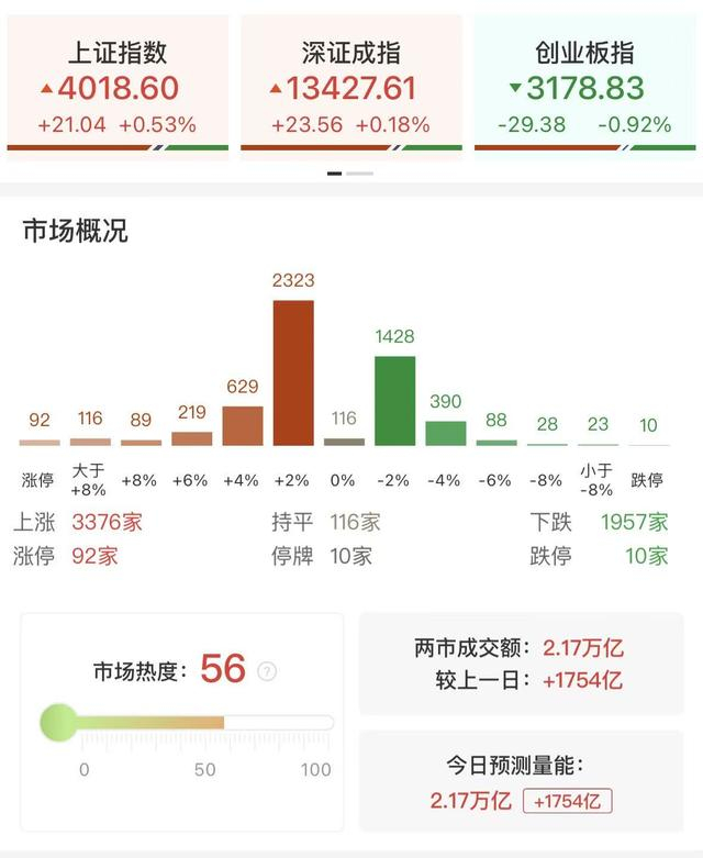 财联社11月10日讯,市场探底回升,三大指数涨跌不一,沪指午后翻红后震荡拉升,创业板指跌幅收窄,此前一度跌超2%。沪深两市成交额2.17万亿,较上一个交易日放量1754亿。盘面上热点快速轮动,大消费板块爆发,食品饮料方向领涨,惠发食品、会稽山等十余股涨停。锂电池板块表现活跃,孚日股份3连板,天际股份、华盛锂电回封2连板。下跌方面,人形机器人概念走弱,浙江荣泰跌停。截至收盘,沪指涨0.53%,深成指涨0.18%,创业板指跌0.92%。