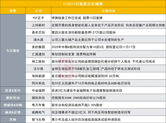 *ST正平(603843.SH)公告称,近日,公司就股票交易情况进行核查,鉴于相关核查工作已完成,经申请,公司股票将于11月12日开市起复牌。经自查,公司目前生产经营情况正常,未发生重大变化,未发现其他可能对公司股价产生较大影响的重大事件;不存在应披露而未披露的重大信息。