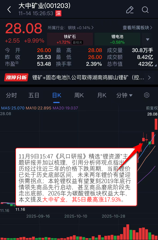 11月9日15:47《风口研报》 精选“锂资源”主题研报并加以梳理,引用分析师观点指出:历经过往近三年的价格下跌周期,当前锂价已处于历史底部区间,未来两年锂价有望迎供需拐点;本轮锂权益有望复刻2019年底行情领先商品先行启动,甚至商品磨底阶段先走出底部,2026年为碳酸锂板块权益大年,本文提及大中矿业,其5日最高涨17.93%。