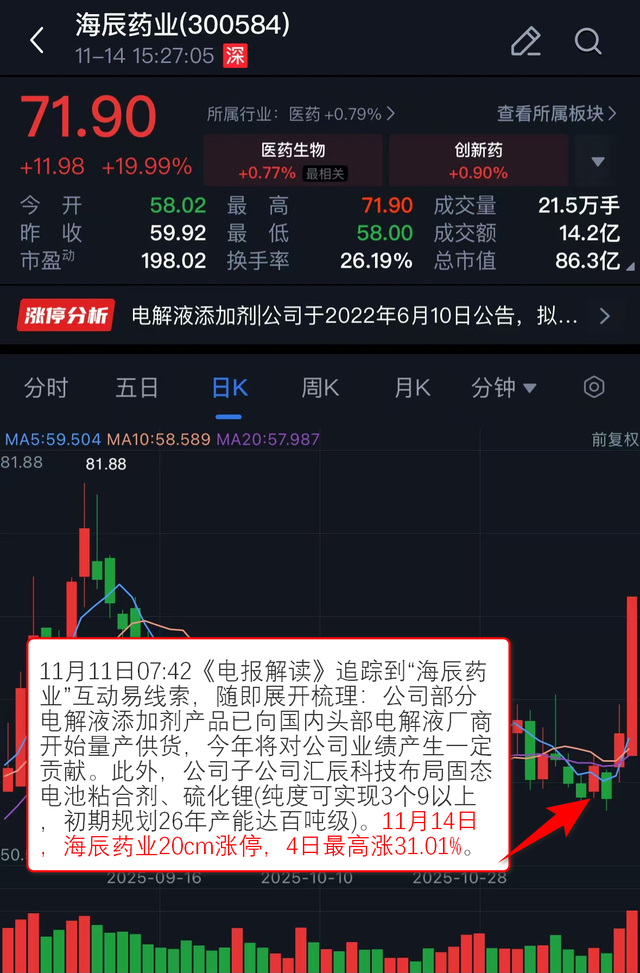 11月11日07:42《电报解读》 追踪到“海辰药业”互动易线索,随即展开梳理:公司部分电解液添加剂产品已向国内头部电解液厂商开始量产供货,今年将对公司业绩产生一定贡献。此外,公司子公司汇辰科技布局固态电池粘合剂、硫化锂(纯度可实现3个9以上,初期规划26年产能达百吨级)。11月14日,海辰药业20cm涨停,4日最高涨31.01%。