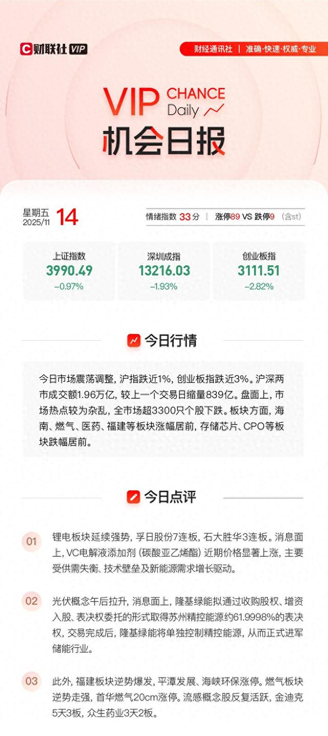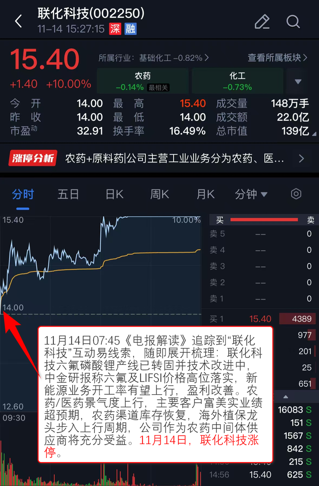 11月14日07:45《电报解读》 追踪到“联化科技”互动易线索,随即展开梳理:联化科技六氟磷酸锂产线已转固并技术改进中,中金研报称六氟及LIFSI价格高位落实,新能源业务开工率有望上行,盈利改善。农药/医药景气度上行,主要客户富美实业绩超预期,农药渠道库存恢复,海外植保龙头步入上行周期,公司作为农药中间体供应商将充分受益。11月14日,联化科技涨停。