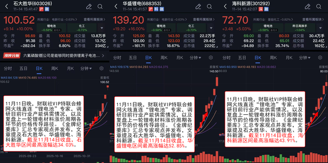 11月11日晚,财联社VIP特联合蜂网火线直连“锂电池”专家,调研目前行业产能供需情况,以及复盘上一轮锂电材料涨价周期各环节的价格传导路径。《金牌纪要库》汇总专家观点并发布,文章提及石大胜华、华盛锂电、海科新源。截至11月14日收盘,石大胜华区间最高涨幅达34.03%,华盛锂电区间最高涨幅达52.85%,海科新源区间最高涨幅达43.91%。