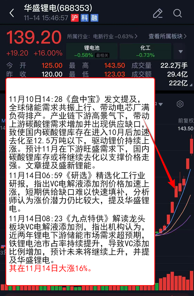 11月14日08:23《九点特供》 解读龙头板块VC电解液添加剂,指出机构认为,近两年锂电下游储能市场需求超预期,铁锂电池市占率持续提升,导致VC添加比例增加,预计未来将继续上升,并提及华盛锂电。