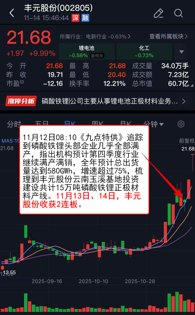 11月12日08:10《九点特供》 追踪到磷酸铁锂头部企业几乎全部满产,指出机构预计第四季度行业继续满产满销,全年预计总出货量达到580GWh,增速超过75%,梳理到丰元股份云南玉溪基地投资建设共计15万吨磷酸铁锂正极材料产线。11月13日、14日,丰元股份收获2连板。