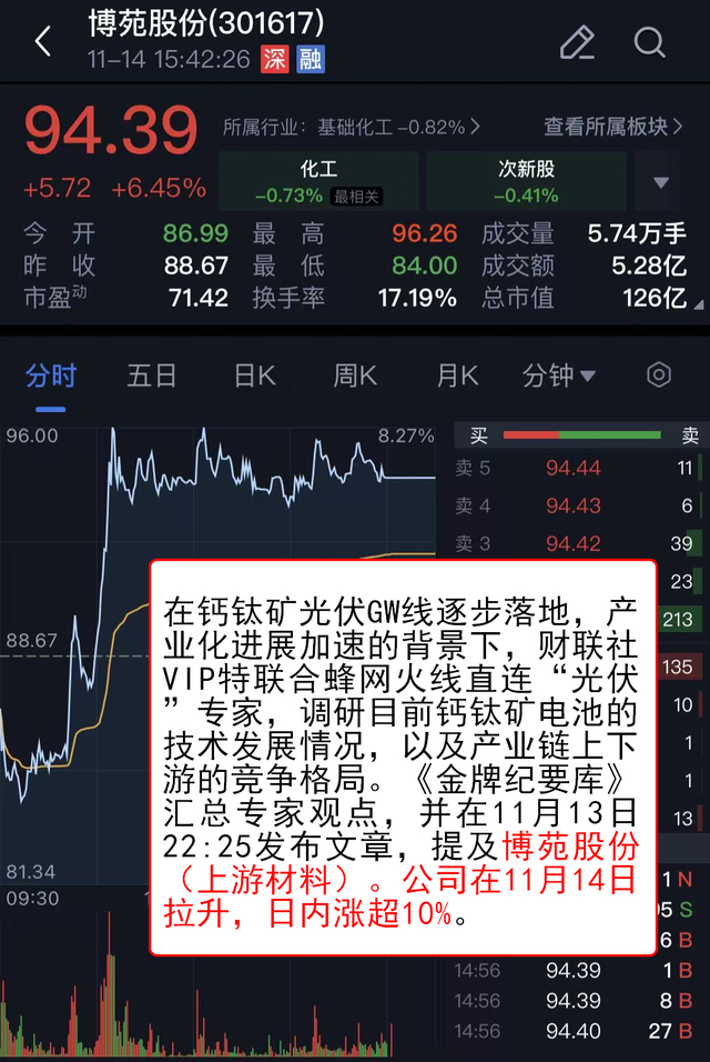 在钙钛矿光伏GW线逐步落地,产业化进展加速的背景下,财联社VIP特联合蜂网火线直连“光伏”专家,调研目前钙钛矿电池的技术发展情况,以及产业链上下游的竞争格局。《金牌纪要库》汇总专家观点,并在11月13日22:25发布文章,提及博苑股份(上游材料)。公司在11月14日拉升,日内大涨超10%。