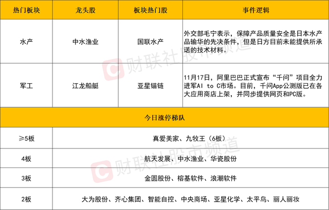 板块上,水产股全线爆发,中水渔业4连板,国联水产、獐子岛、大湖股份、开创国际、东方海洋、好当家等个股涨停。