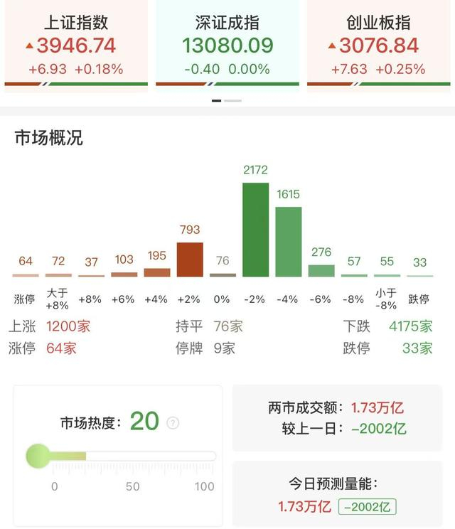财联社11月19日讯,市场窄幅震荡,沪指、创业板指均收红。沪深两市成交额1.73万亿,较上一个交易日缩量2002亿。盘面上,市场热点较为杂乱,全市场超4100只个股下跌。从板块来看,水产概念集体爆发,中水渔业、国联水产等近10股涨停。军工板块表现活跃,江龙船艇3天2板。银行板块走强,中国银行涨超3%创历史新高。锂电板块反复活跃,金圆股份3连板。下跌方面,高位股明显分化,东百集团、三木集团、胜利股份、海南海药跌停。截至收盘,沪指涨0.18%,创业板指涨0.25%。