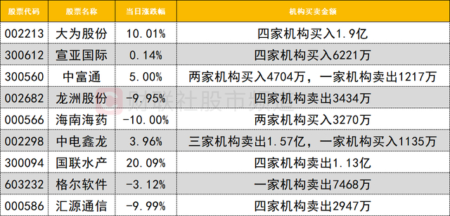 卖出方面,国联水产遭四家机构卖出1.13亿。格尔软件遭一家机构卖出7468万。