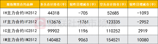 四大期指主力合约中,IC、IM合约多空双方均加仓,IM合约空头加仓数量较多。