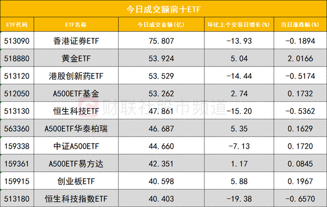 从成交额前十的ETF来看,香港证券ETF(513090)成交额位居首位,黄金ETF(518880)成交额位居次席。