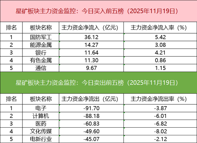 板块资金流出方面,电子板块主力资金净流出居首。
