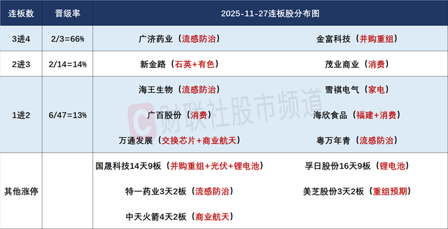 财联社11月27日讯,今日53股涨停,34股炸板,封板率为61%,广济药业、金富科技4连板,茂业商业、新金路3连板,粤万年青20cm2连板,国晟科技14天9板。市场冲高回落,三大指数涨跌不一,创业板指、深成指先后翻绿,创业板指此前一度涨超2%。沪深两市成交额1.71万亿,较上一个交易日缩量736亿。盘面上,市场热点快速轮动,全市场超2700只个股上涨。板块方面,有机硅、电池、消费电子等板块涨幅居前,海南、影视院线、AI应用等板块跌幅居前。截至收盘,沪指涨0.29%,深成指跌0.25%,创业板指跌0.44%。