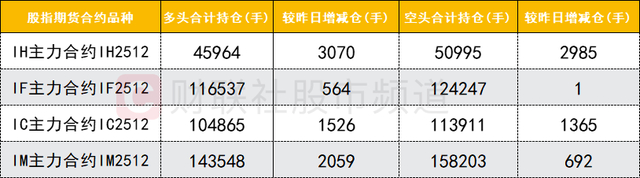 四大期指主力合约中,IH、IF、IC、IM合约多空双方均加仓,IM合约多头加仓数量较多。
