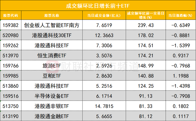 从成交额环比增长前十的ETF来看,创业板人工智能ETF南方(159382)成交额环比增长239%位居首位;港股通科技30ETF(520980)成交额环比增长178%位居次席。