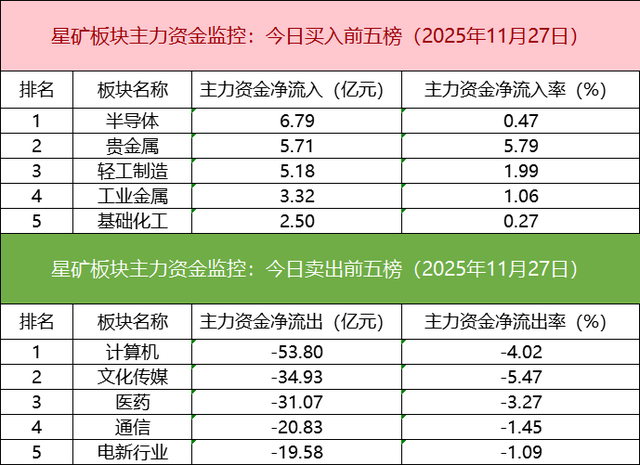 从主力板块资金监控数据来看,半导体板块主力资金净流入居首。