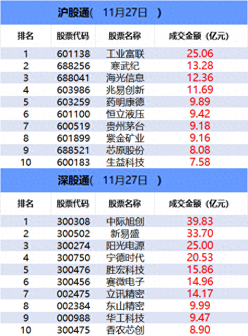 从沪股通前十大成交个股来看,工业富联位居首位;寒武纪和海光信息分居二、三位。