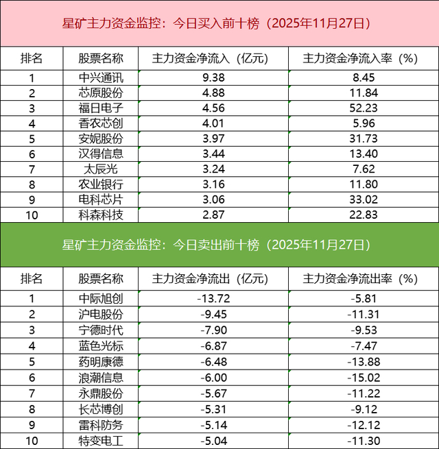 主力资金流出前十的个股所属板块较为分散,中际旭创净流出居首。
