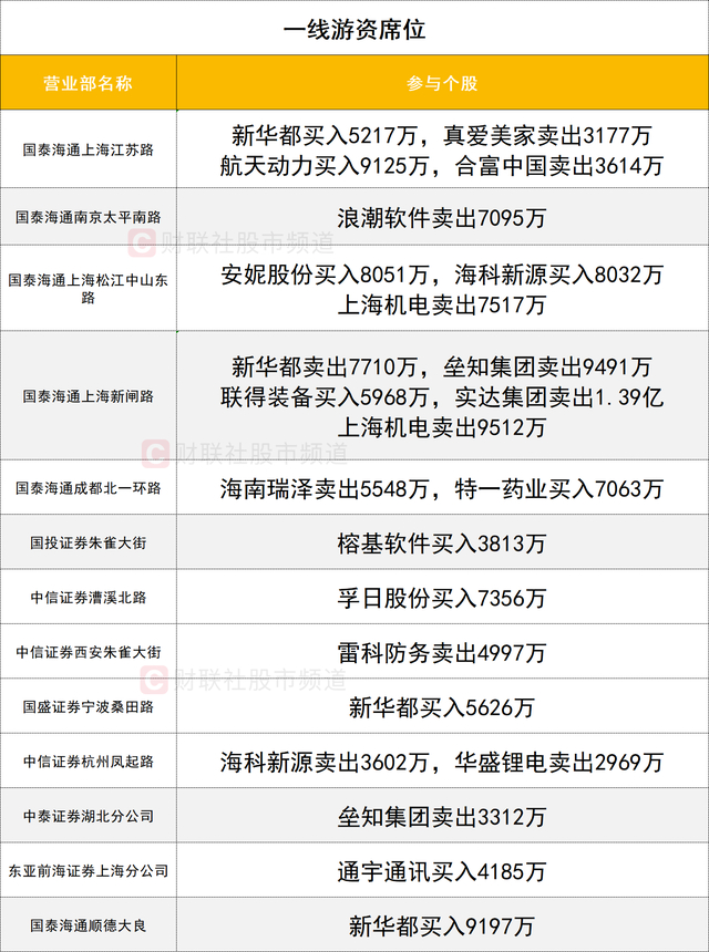 新华都今日炸板回落,四家一线游资激烈博弈该股。其中三家实力游资席位(国泰海通证券顺德大良、国盛证券宁波桑田路、国泰海通证券上海江苏路)分别买入9197万、5626万、5217万。另一家实力游资席位(国泰海通证券上海新闸路)大笔卖出7710万。
