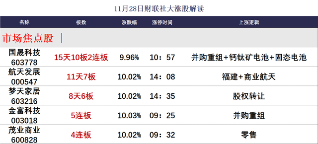北京在太空数据中心建设工作推进大会上宣布,拟在700-800公里晨昏轨道建设运营超过千兆瓦(GW)功率的集中式大型数据中心系统,以实现将大规模AI算力搬上太空。商业航天概念再获提振,全天呈现强势拉升,乾照光电、航天环宇双双录得20厘米涨停,10厘米人气股航天发展、雷科防务双双实现反包板。随着板块内今日现个股批量涨停,板块短线迎来高潮后,下周初分化在所难免。目前市场聚焦的重点因素无疑是计划于本周六即11月29日首飞的可回收火箭朱雀三号。但该火箭完成发射仍暂时不能视为该板块消息面最终兑现完毕,12月上旬天兵科技的天龙3号发射或成为板块下一个博弈的重要时间节点。