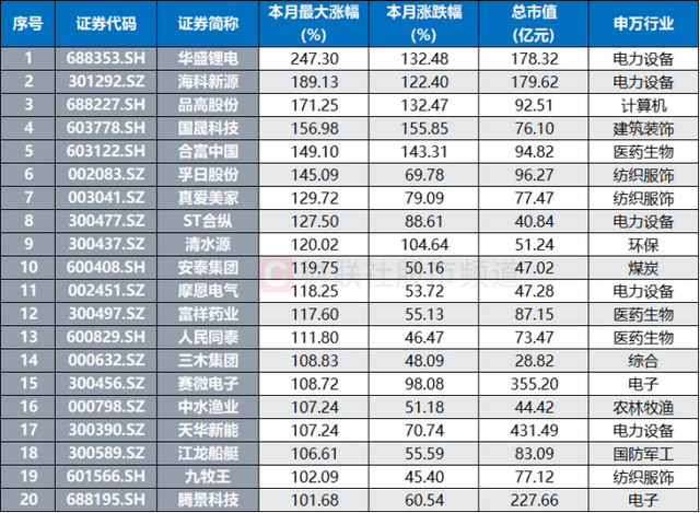 具体个股来看,剔除本月上市新股,月内获翻倍行情的个股中,华盛锂电月内最大涨幅唯一录得2倍以上,达247.30%。同时,海科新源、品高股份、国晟科技、合富中国、孚日股份、真爱美家、ST合纵、清水源等股也表现活跃。若仅以月内涨幅统计,国晟科技、合富中国、华盛锂电、品高股份、海科新源、清水源5股本月涨幅在100%以上。