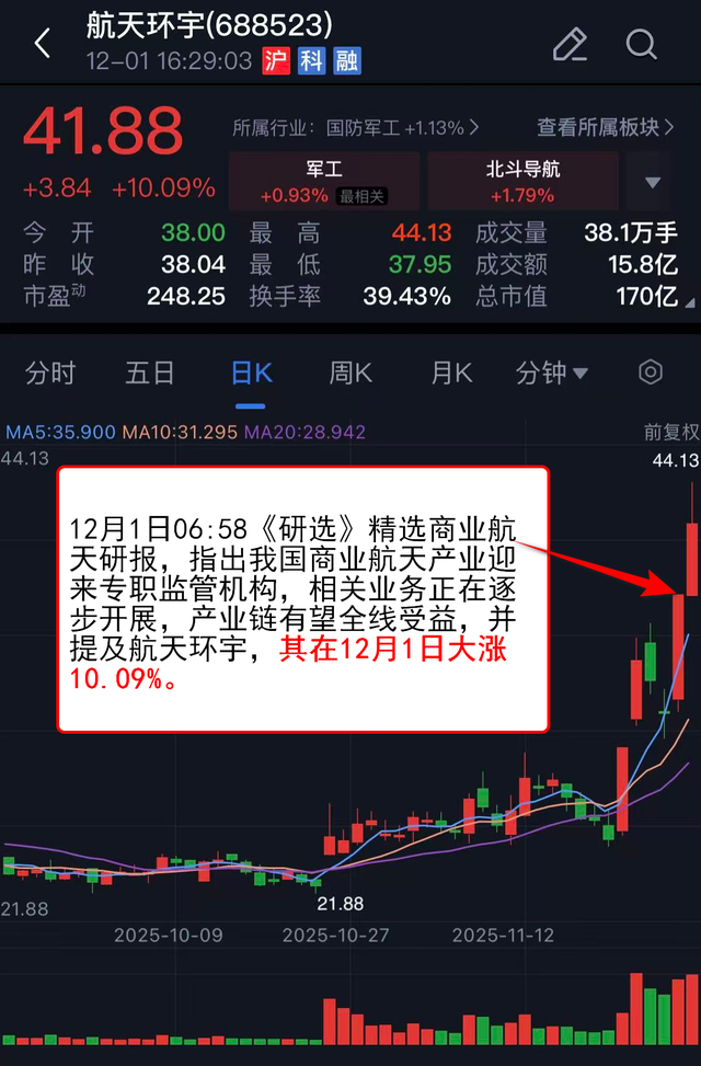 12月1日06:58《研选》 精选商业航天研报,指出我国商业航天产业迎来专职监管机构,相关业务正在逐步开展,产业链有望全线受益,并提及航天环宇,其在12月1日大涨10.09%。