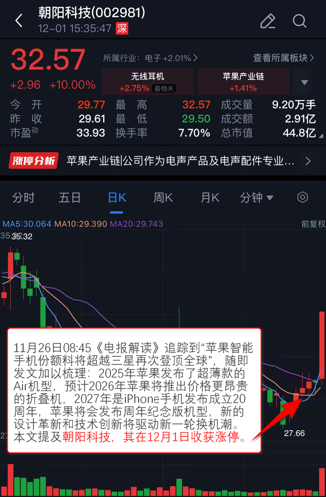 11月26日08:45《电报解读》 追踪到“苹果智能手机份额料将超越三星再次登顶全球”,随即发文加以梳理:2025年苹果发布了超薄款的Air机型,预计2026年苹果将推出价格更昂贵的折叠机,2027年是iPhone手机发布成立20周年,苹果将会发布周年纪念版机型,新的设计革新和技术创新将驱动新一轮换机潮。本文提及朝阳科技,其在12月1日收获涨停。